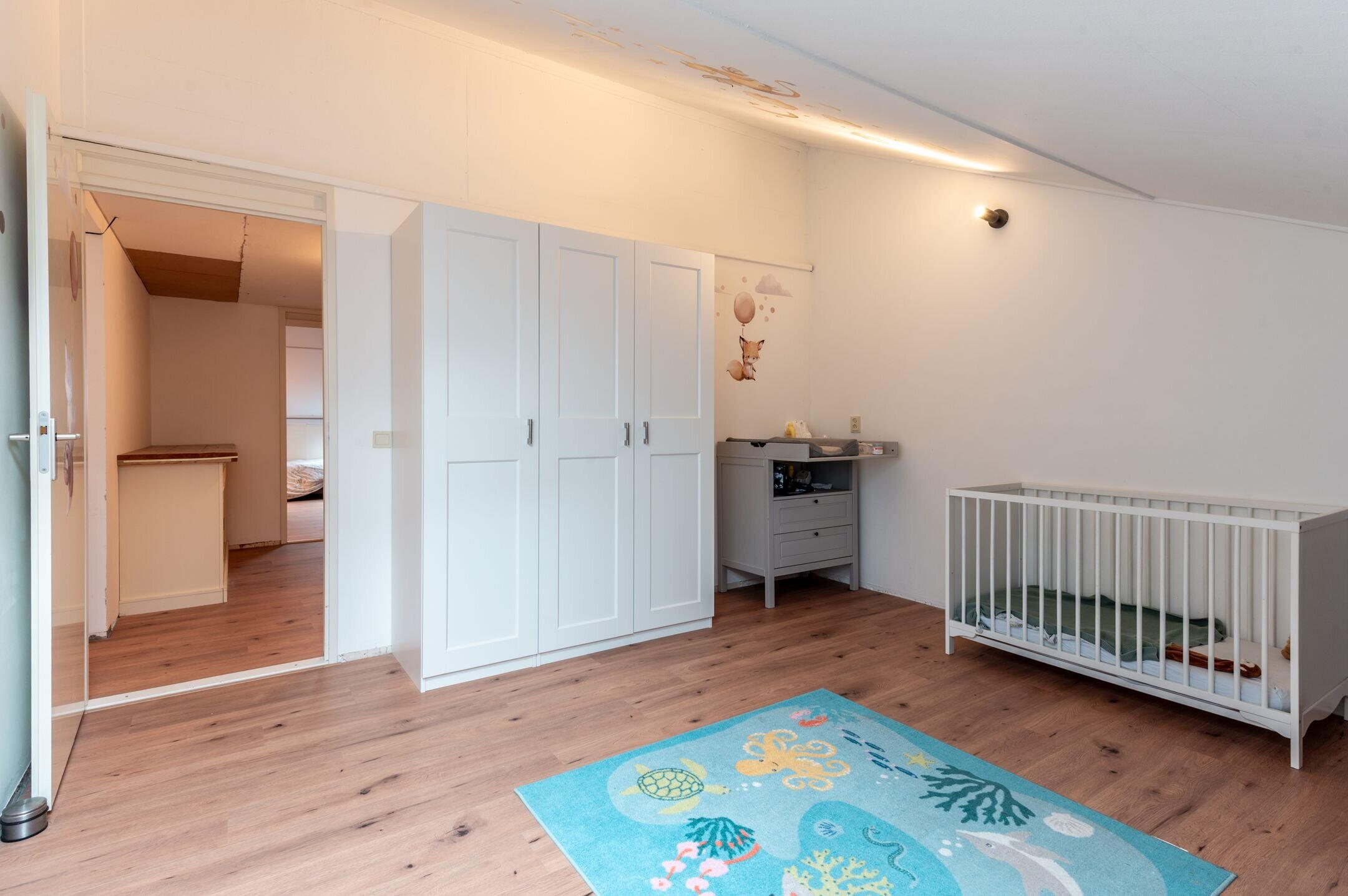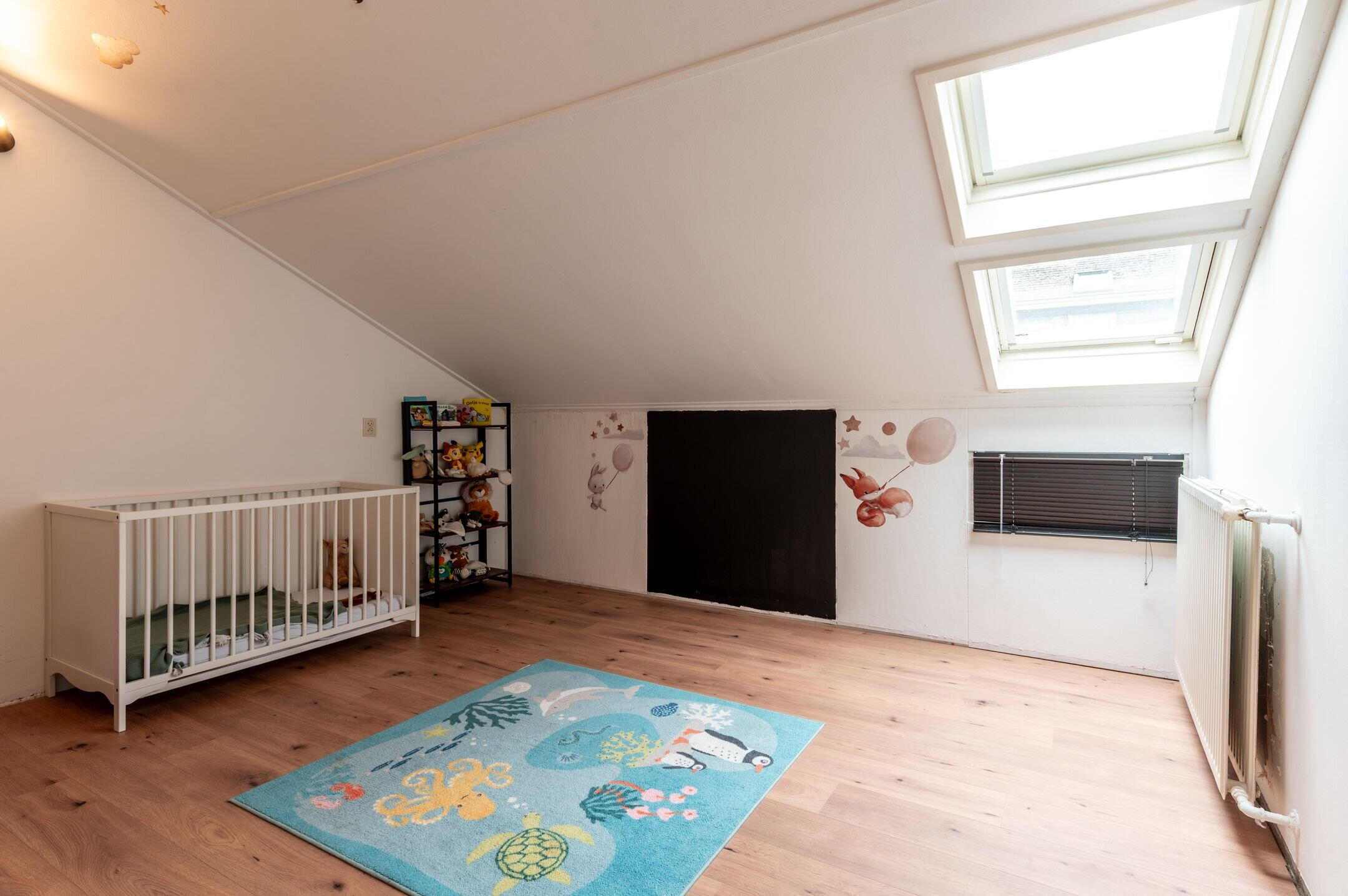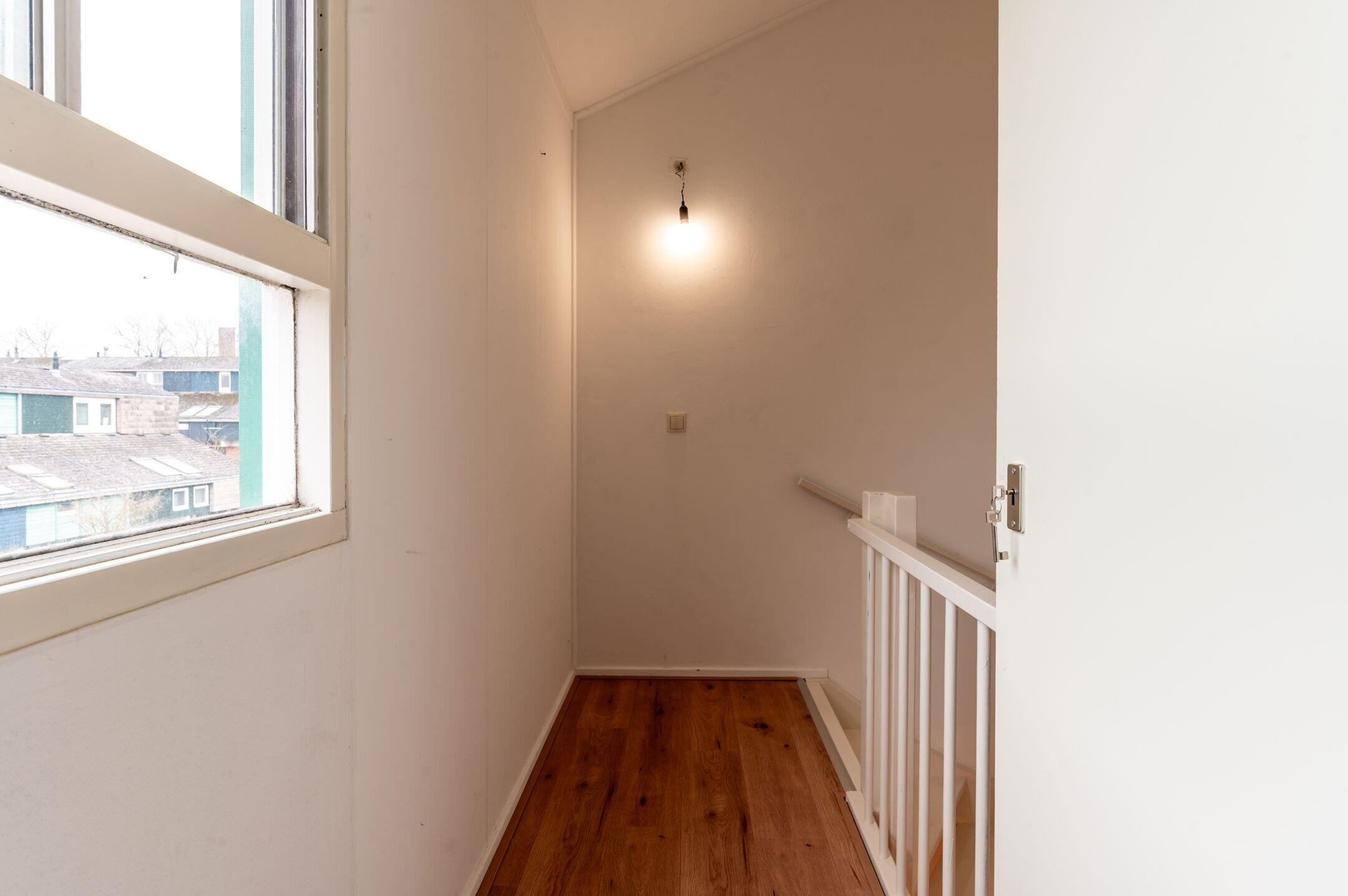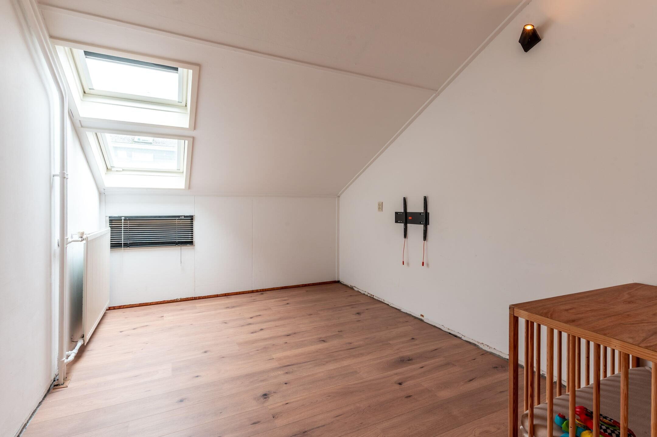 Eerste verdieping: Ruime overloop met een inpandige bergkast met de wasmachine aansluiting; drie slaapkamers (respectievelijk 9,6 / 13,8 en 16,9m²), allen voorzien van dakramen; moderne, volledig betegelde badkamer (2023) met een flinke inloopdouche, vrijhangend toilet, designradiator en een fraai wastafelmeubel met dubbele wastafel en spiegelkast.